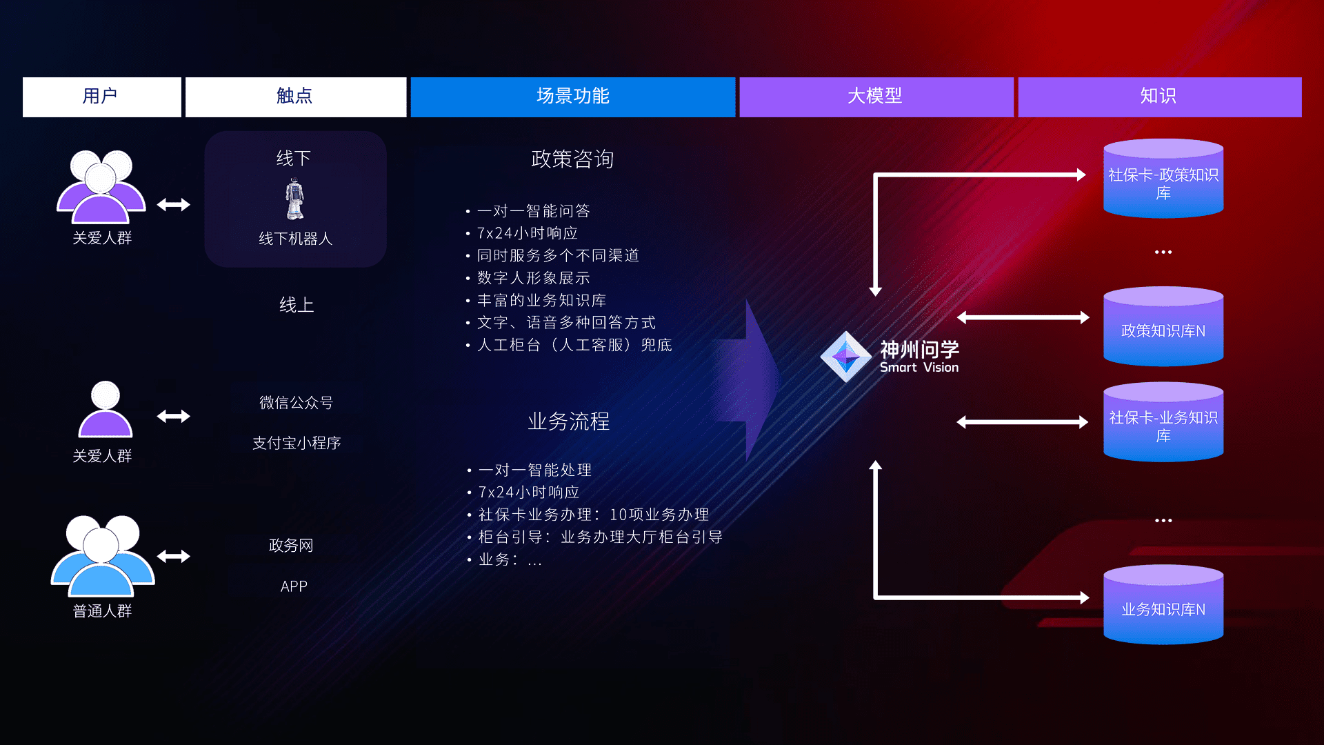 • 利用大语言模型+RAG技术,,,,支持多轮对话,,,可识别多种同义词、、、、近义词,,,精准理解关爱人群语义快速输出结果。。。